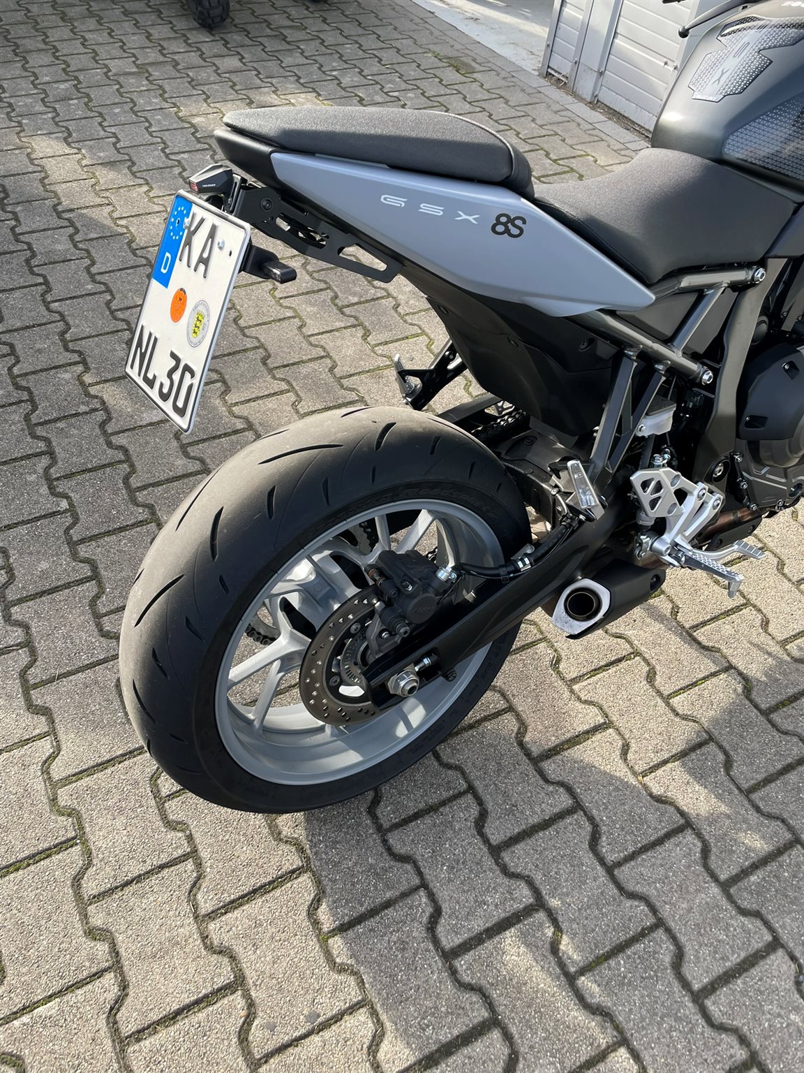 Unsere 8S ist zusätzlich mit einem kurzen Kennzeichenhalter sowie mit kleinen LED Blinkern ausgestattet.